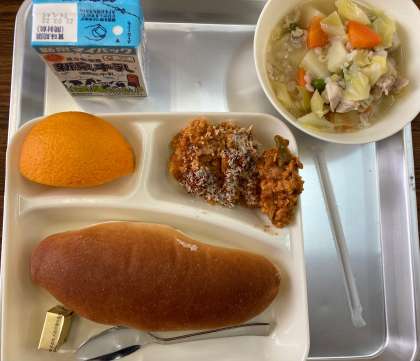 今日の給食の献立は、豆腐のミートグラタン、押し麦と野菜のスープ煮、デコポン、パン、牛乳でした。豆腐のミートグラタンは、豆腐が入っているので、優しい味わいになっていました。押し麦は、食感がたのしく、たくさんの野菜を食べることができます。デコポンは、熊本県や愛媛県、和歌山県、佐賀県などで多く栽培されています。冬から春にかけてが美味しい時期です。