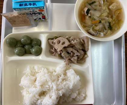 今日の給食の献立は、豚肉とれんこんの炒め煮、五目汁、きな粉よもぎだんご、ご飯、牛乳でした。豚肉とれんこんの炒め煮は、れんこんのシャキシャキ、ほくほくした食感が楽しめました。五目汁には鶏肉やかまぼこが入っていて、他の野菜からも出汁が出ていて深い味わいでした。よもぎだんごは、よもぎから作られます。よもぎはキク科の植物で、山や野原に自然に生えています。春に生える柔らかな新芽をつぶしてだんごに入れます。今日の給食では、甘い蜜を絡めたよもぎだんごに、きな粉をかけて食べます。