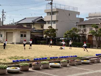 芝生広場で1年生の人たちが遊んでいました。芝生の上だと転んでも平気です。チューリップの芽が出たよと教えてくれました。水やりをしていた子は、自分の鉢だけでなく、周りの鉢にも水をあげていて感心しました。ここにも優しい心が育っています。