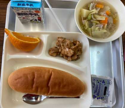 今日の給食の献立は、鶏肉の味噌バターソース、洋風煮、デコポン、パン、牛乳、ブルーベリージャムでした。鶏肉は、味噌バターの豊かなコクと風味を味わえました。味噌は蒸した大豆に麹(原料に菌をつけて増やしたもの)と塩を加えて発酵させたものです。麹の原料の違いで、米味噌、麦味噌、豆味噌に分けられます。熟成させる時間によって色が変わり、白味噌や赤味噌などの違いができます。洋風煮はいろいろな野菜からも出汁が出ていて、優しい味わいでした。デコポンも旬の味を味わえました。