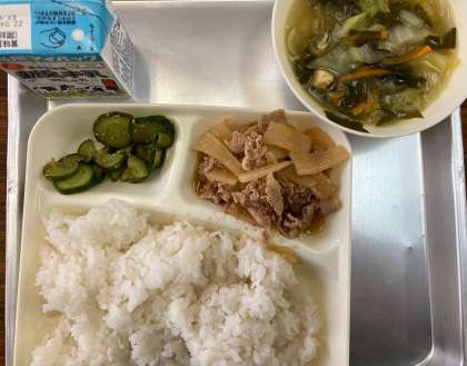 今日の給食の献立は、豚肉のコチュジャン炒め、豚肉と春雨のスープ、きゅうりのナムル風、ご飯、牛乳でした。豚肉の炒め物は、だいこんも入っていて、にんにくとコチュジャンの香りがしました。春雨のスープにはわかめも入っていて、いい香りでした。きゅうりのナムル風にはいりごまが入っていて、きゅうりの歯応えが楽しめました。今年の給食は、今日が最後です。一年間、おいしく食べて、子どもたちは元気にひと回り大きくなりました。
