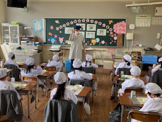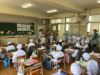 1年生が小学校はじめての給食です。先生に配膳してもらうまで、おとなしく待っていました。今日のメニューは、麻婆豆腐、きゅうりとコーンの甘酢和え、もやしとピーマンの胡麻炒め、牛乳、ごはん、でした。麻婆豆腐は辛くないので1年生の子どもたちでも大丈夫。これから給食をしっかりと食べて元気な子に育ってくださいね。