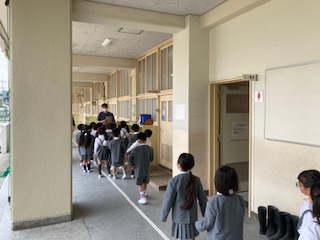 1年生の子どもたちが学校たんけんをしています。職員室はここ、保健室はここ、先生と一緒に学校の中をまわります。迷子にならないようにしましょうね。