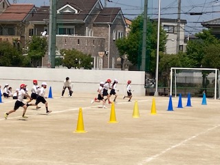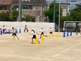 2年生の子どもたちが運動場で元気に体育の授業をしていました。コーンをくるくる回りながら走っていきます。からだのバランスを保ちながら、くるくるくるくる、みんな上手です。