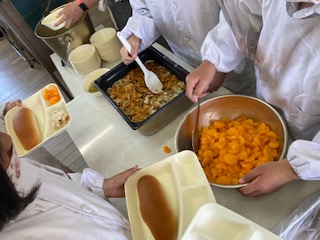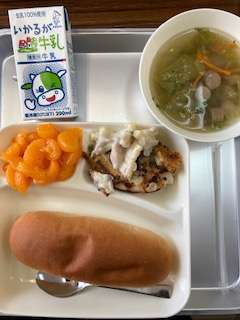 今日の給食のメニューは、マカロニグラタン、レタスのスープ、みかん(缶)、牛乳、パン、でした。マカロニグラタンはとてもクリーミーで、焦げ目もあって香ばしさも感じられました。レタスのスープはレタスと細かく刻まれたにんじん、ウインナーが入っていて、パセリの香りがアクセントになっていました。みかん(缶)は子どもたちも大好きです。