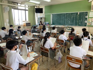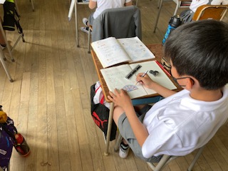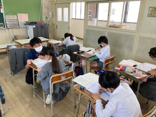 定規と分度器を使って三角形を描きます。一辺の長さがわかっていて、その両端の角度がわかっています。先生が一人ひとりていねいに見て回り、少し困っている子や間違っている子を見つけてサポートしていきます。となりのクラスからはいきのあった音読が聞こえてきました。とても上手でした。