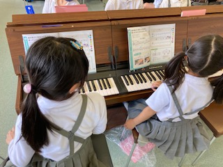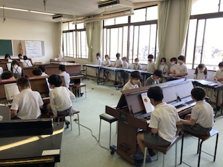 音楽室から楽器のリズムが聞こえてきました。3年生の子どもたちがオルガン、木琴や鉄琴を使ってドレミの練習です。先生と一緒に音の高さに気をつけて、それぞれの楽器を交代しながら練習していました。