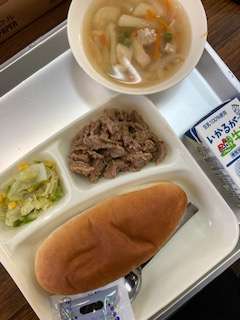 今日の給食のメニューは、豚肉のデミグラスソース、スープ、キャベツとコーンのソテー、牛乳、パン、でした。豚肉のデミグラスソースは手作りの濃厚なソースが豚肉にからませてあって味わい深かったです。スープはチキンスープをベースにして、鶏肉、にんじん、たまねぎ、じゃがいも、グリンピースが入っていました。キャベツとコーンのソテーはコーンの甘さがアクセントになっていました。