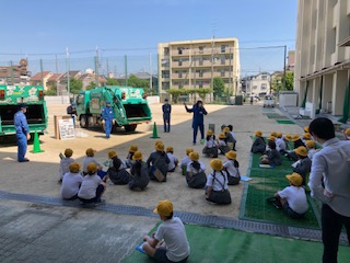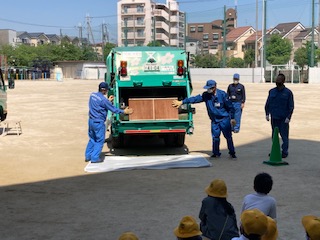 環境事業局の方がパッカー車の説明をしてくれています。この2台は同じように見えて、用途が、違いました。子どもたちは職員の方の説明に耳を傾けながら、興味深くパッカー車を見ていました。大きな音を立てながらタンスがつぶされて取り込まれていく様子に子どもたちもびっくりしていました。