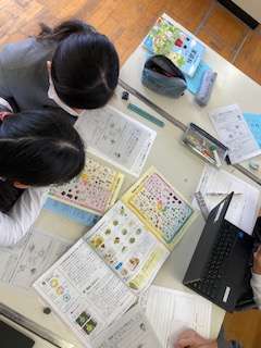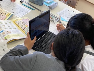 子どもたちはもし自分で朝食をつくるなら、どんな朝食にすればよいか考えていました。栄養バランスを考えて、うーん。あれも食べたいな。でもちょっと食べすぎかな。タブレットで調べたり、分類表を参考にしたりして、楽しみながら考えていました。