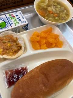 今日の給食のメニューは、豚肉と野菜のカレースープ煮、変わりピザ、みかん(缶)、牛乳、パン、でした。スープ煮は野菜がたくさん入っていて、じゃがいもがやわらかくホクホクしていました。変わりピザはぎょうざの皮を使っていて、パリッとして結構いけます。どちらもおいしかったです。