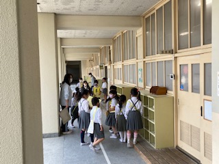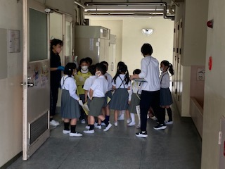 1・2年生の子どもたちが、がっこうたんけんをしました。2年生のお兄ちゃんお姉ちゃんが1年生を連れて、学校の中を案内しています。何日も前から、2年生は準備をしてきました。どこを回るのか?どうやって説明するのか?何度も練習していました。