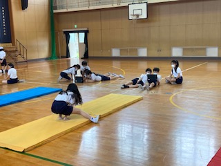 5年生が体育の授業で、マット運動をしていました。基本の前転や開脚前転に取り組んでいました。タブレットを使ってお互いに撮影し合っています。手のつき方、膝の伸ばし具合、回転のリズム、よくわかります。ここをもう少し直したらいいよ、上手にできてるよ、子どもたちはお互いに気づいたことを伝えて教え合っていました。とても微笑ましい光景でした。