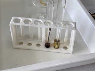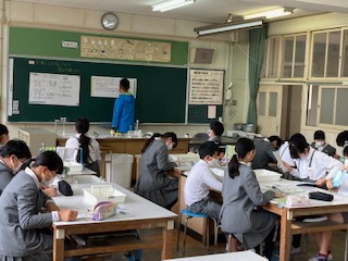 6年生の子どもたちが理科室でヨウ素液を使って実験をしていました。だ液を加えたでんぷん液は色が変化せず、だ液を加えていないでんぷん液は青むらさき色に変化しました。ということはだ液がでんぷんを別のものに変化させたのかな?食べ物をかみくだいたり体に吸収されやすいものに変えたりするはたらきを消化といいます。消化にかかわるだ液のような液体を消化液といいます。子どもたちはわかったことをしっかりとノートにまとめていました。