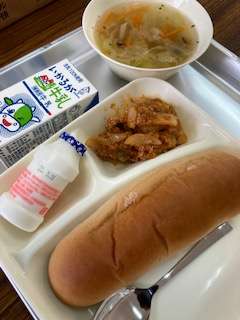 今日の給食のメニューは、じゃがいものミートグラタン、スープ、発酵乳、牛乳、パン、でした。じゃがいものミートグラタンは焦げ目が香ばしく、牛豚ひき肉とじゃがいも、たまねぎ、グリンピースがケチャップ風味のミートソースに包まれていました。スープはチキンスープがベースのさっぱりとした薄めの味付けで飲みやすかったです。あと発酵乳がついていました。