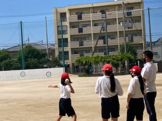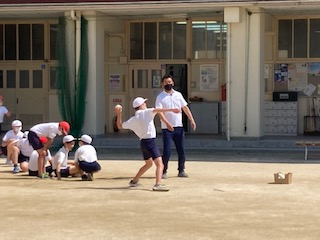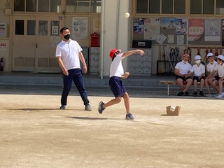 後日、ソフトボール投げの記録をとります。それに向けて6年生の子どもたちが練習をしていました。先生に投げるフォームを教えてもらいます。先生は野球経験があるので教え方も上手です。少しアドバイスするだけで、みんなの投げるフォームもよくなっていきます。子ども一人一人投げる力の違いはありますが、どの子も精一杯投げている姿がかっこよかったです。記録が少しでも伸びるといいですね。