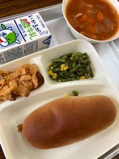 今日の給食のメニューは、ケチャップ煮、さんどまめとコーンのソテー、りんごのクラフティ、牛乳、パン、でした。クラフティはフランスの伝統的な焼き菓子です。卵、クリーム、砂糖、小麦粉などで作った生地にくだものを加え、オーブンで焼いて作ります。今日の給食では、りんごの缶詰めを使ったりんごのクラフティでした。