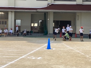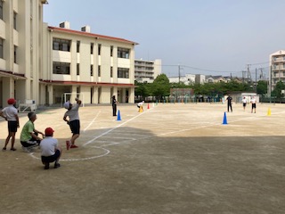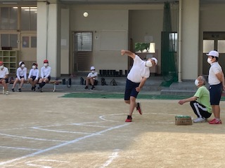 今日は各学年でソフトボール投げの記録をとります。昨日の放課後に先生たちがみんなで運動場にソフトボール投げのラインを引きました。トップバッターは6年生です。さあ練習の成果を出せるかな。みんなが投げるたびに、がんばれー、おー、などの声が上がります。中には50mを超える子もいました。すごいー、の声が・・・。