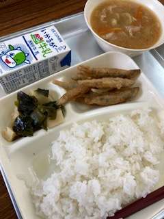今日の給食のメニューは、きびなごてんぷら、豚汁、わかたけ煮、牛乳、ごはん、でした。きびなごてんぷらはころもがカリッと揚げられていて、しょうゆベースの甘酸っぱいタレがかけられていました。豚汁は具だくさんでした。春に収穫されるたけのことわかめは[春先の出会いもの]といわれ、煮ものや汁ものによく組み合わされています。給食ではわかたけ煮として、煮ものにしています。