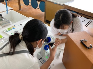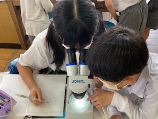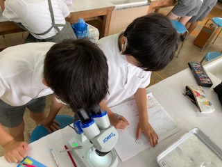 5年生の子どもたちがメダカのたまごを観察していました。メダカのたまごを水草ごとペトリ皿にとり、双眼実体顕微鏡を使って覗きこみます。見えたたまごの様子をノートにていねいにスケッチしていました。
