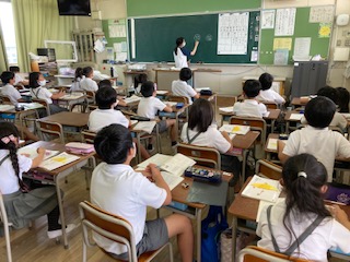 3年生の子どもたちが勉強している教室の後ろで、もぐもぐ モグモグ。