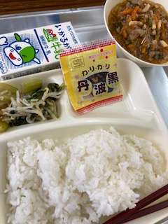 今日の給食のメニューは、麻婆はるさめ、チンゲンサイともやしの甘酢和え、いり黒豆、牛乳、ごはん、でした。麻婆はるさめはトウバンジャンで少しだけ辛味をきかせた味付けで、ごはんがすすみ、子どもたちにも好評です。