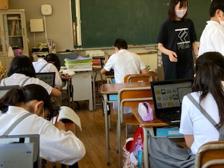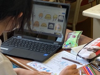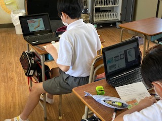 6年生の子どもたちがタブレットを使って、地震について調べていました。地震のメカニズム、断層の種類とでき方、地震の頻度や強さ、地震の多い地域、避難の仕方、防災グッズ・・・、調べた内容や図、グラフなどを紙に書きとめ、あとで学習に使います。