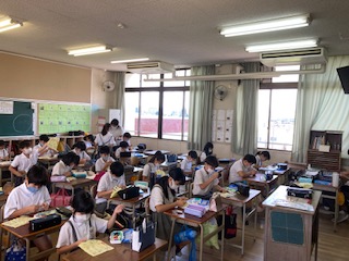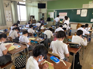 5年生になると、家庭科の学習が始まります。おもに実習としては、裁縫と調理があります。子どもたちはとても楽しみにしています。裁縫の基本、針と糸を使って、なみぬい、本返しぬい、半返しぬい、かがりぬい、ボタンつけ、玉どめ、玉結び、です。みんな、黙々と集中して取り組んでいました。