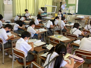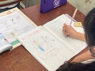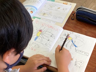 チョウの成虫の体は、頭、むね、はら、の3つに分かれ、むねに6本のあしがあります。子どもたちは昆虫の体のつくりについてノートにまとめていました。チョウの育ちについても順をおって絵を描きながら上手にまとめていました。
