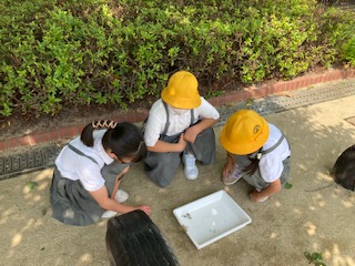 子どもたちはトレイにビー玉を数個入れて、運動場のあちこちを歩き回っています。地面に置くとビー玉が転がって一か所に集まりました。こっちが低くなってるみたいだよ。
