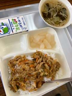今日の給食のメニューは、和風カレー丼、すまし汁、和なし(缶)、牛乳、でした。和風カレー丼はだしこんぶとけずりぶしのだしの風味をきかせた和風カレーをごはんにかけて食べます。うすあげにカレーだしがしみ込んでいておいしいです。子どもにも好評な献立です。すまし汁はコクが感じられ、えのき、わかめ、キャベツが入っていました。和なしは缶詰めのものです。