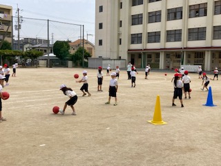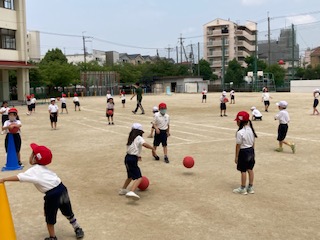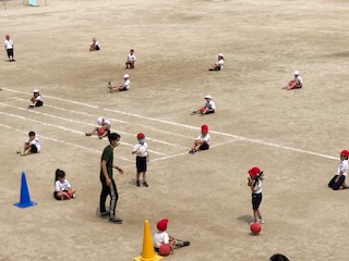 先生が子どもたちにいっぱい声かけをしている中、楽しみながらボールを投げたり受けたり・・・。からだを動かすって気持ちいいね。