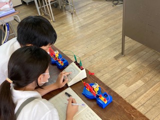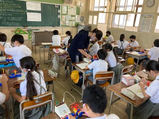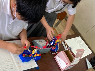 乾電池をつなぐ向きと、モーターの回る向きには、どんな関係があるのだろうか。4年生の子どもたちが実験をしていました。いろいろな予想が出ました。動かない、変わらない、反対になる、それぞれの予想にきちんと一つ一つ理由を述べていたところがすばらしいかったです。子どもたちが先生と一緒に楽しく実験に取り組んでいるようすが印象的でした。