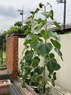 正門前に大きなひまわりが咲いています。3m以上あります。毎年、なぜか、この場所に咲くのです。いつも大きく育ちます。種を蒔いているわけではないけれど、毎年、立派なひまわりが咲くのです。