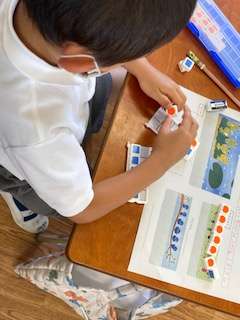 子どもたちはたし算を習いました。今日からひき算です。教材ブロックを使いながら、自力で解決できるよう先生がうながしていきます。子どもたちは口々に考えについて話しながらブロックを動かしていました。