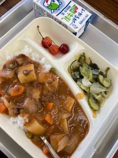 今日の給食のメニューは、ハヤシライス、ミックス海藻サラダ、さくらんぼ、牛乳、でした。ハヤシライスは食べやすく、みんな大好きです。ミックス海藻サラダは少し海藻のぬめりのあるサラダでした。さくらんぼは自然の甘さが感じられました。おいしかったです。