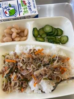 今日の給食のメニューは、牛丼、きゅうりの生姜づけ、大福豆の煮もの、牛乳、でした。牛丼は子どもたちにも人気のメニューで、一気に食べてしまいそうです。きゅうりの生姜づけは生姜汁を使った調味液につけてあり、さっぱり感がありました。大福豆の煮ものは甘く味つけられていてやわらかかったです。