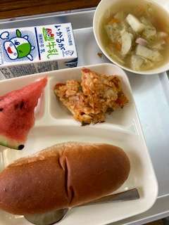 今日の給食のメニューは、パエリア、ウインナーとキャベツのスープ、すいか、牛乳、パン、でした。パエリアは旬の赤ピーマンを使って、さんど豆の緑色、カレー粉の黄色で彩りよく仕上げています。鶏肉といかも入っていました。ウインナーとキャベツのスープはチキンスープをベースに塩こしょう、しょうゆで味をととのえてありました。すいかは甘くてみずみずしく夏が感じられました。