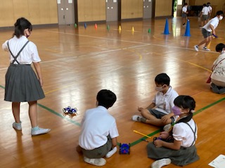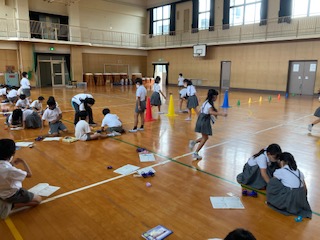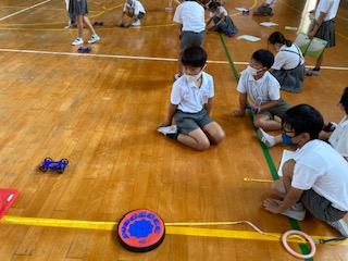 3年生の子どもたちが講堂で理科の実験をしていました。ゴムをのばす長さと車が動くきょりの関係について調べていました。そりゃあ、長くのばした方が遠くまで走るんじゃないのかな?子どもたちは予想を立てて、少しずつゴムをのばす長さを変えながら、実験結果をプリントに書きとめていきました。グループで協力しているようすに微笑ましく思いました。
