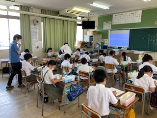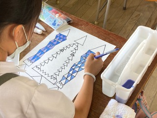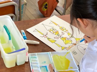 ていねいに色をぬることが目標です。同じ系統の色を少しずつ変えながら、となりが同じ色で重ならないようにするそうです。いろんな模様のお城ができそうです。