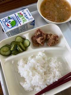 今日の給食のメニューは、豚肉の竜田揚げ、みそ汁、きゅうりの甘酢づけ、牛乳、ごはん、でした。豚肉の竜田揚げは生姜と醤油の香りがきいていて、豚肉も厚みがありました。みそ汁はオクラのとろみとかぼちゃの甘みが合わさっておいしかったです。きゅうりの甘酢づけは口あたりがさっぱりとしていました。