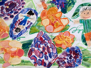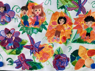 3年生の教室に絵画の作品が掲示してありました。テーマは[ふしぎな花]だそうです。たくさんの花に囲まれて楽しそうに遊ぶ子どもたちのようすが描かれています。どの絵もとてもていねいに描かれています。どの子も一生懸命に描いています。すごいなぁ。そして何よりもっと驚いたのは・・・、
