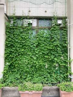 緑のカーテンはヘチマやゴーヤなどのつる性の植物で建物の窓やかべをおおい、強い夏の日差しを和らげるなど、さまざまな効果の期待できる地球にやさしい自然のカーテンです。本校では玄関横でゴーヤを植えて取り組んでいます。