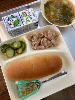 今日の給食のメニューは、鶏肉のから揚げ、中華みそスープ、きゅうりとコーンの甘酢和え、牛乳、パン、でした。鶏肉のから揚げは下味がしっかりとついていて、ころももカリッと揚げられていました。中華みそスープは野菜がたっぷり入っていました。きゅうりとコーンの甘酢和えはさっぱりとした口あたりで、おいしかったです。