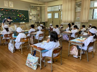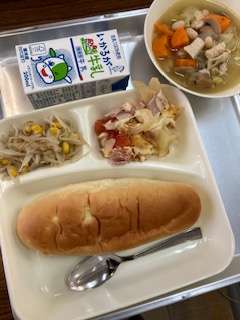 今日の給食のメニューは、鶏肉とてぼ豆のスープ煮、じゃがいもとトマトのチーズ焼き、もやしとコーンのソテー、牛乳、パン、でした。今日で1学期の給食は終了です。1年生もしっかり給食を食べられるようになりました。また2学期も安全でおいしい給食を提供していきたいと思います。ごちそうさまでした。