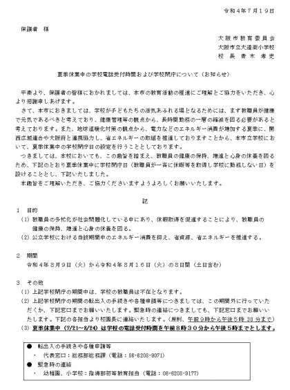 明日8月9日(火)〜16日(火)の期間、学校閉庁日となります。