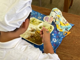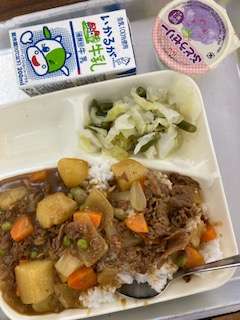 今日の給食のメニューは、ビーフカレーライス、野菜のピクルス、ぶどうゼリー、牛乳、でした。今日のカレーは小麦粉の代わりに米粉を使ったカレールウを使っており、アレルギー対応メニューとなっています。牛肉の旨味もしっかりと味わうことができました。子どもたちも喜んで食べていました。やっぱりカレーは子どもたちの定番ですね。野菜のピクルスはキャベツとさんどまめが使われていて、さっぱりとした味つけです。小さなぶどうゼリーがついていました。