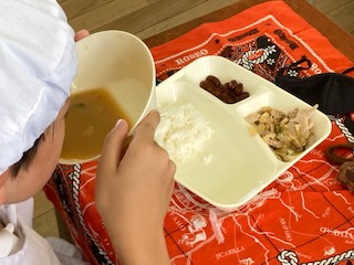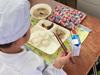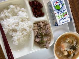 今日の給食のメニューは、豚肉の甘辛焼き、みそ汁、金時豆の煮物、牛乳、ごはん、でした。豚肉の甘辛焼きは豚肉に砂糖、塩、しょうゆで下味をつけ、たまねぎ、ピーマンを混ぜ合わせて風味豊かに焼いています。ごはんにぴったりです。みそ汁はとうふ、キャベツ、にんじん、もやし、えのき、わかめが入っていました。金時豆の煮物はやわらかくて甘かったです。