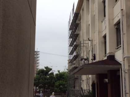 本校では、2学期からエアコンが各教室につきます。その準備として、ガスの配管や、各教室の窓側の準備のため、7月4日(土)から、校舎に足場が組まれています。