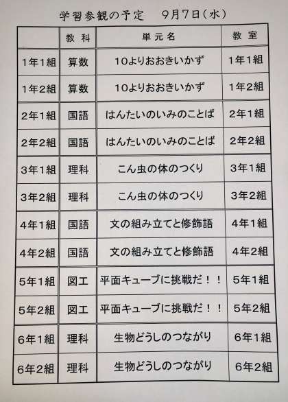 明日9月7日(水)は学習参観(学校公開)です